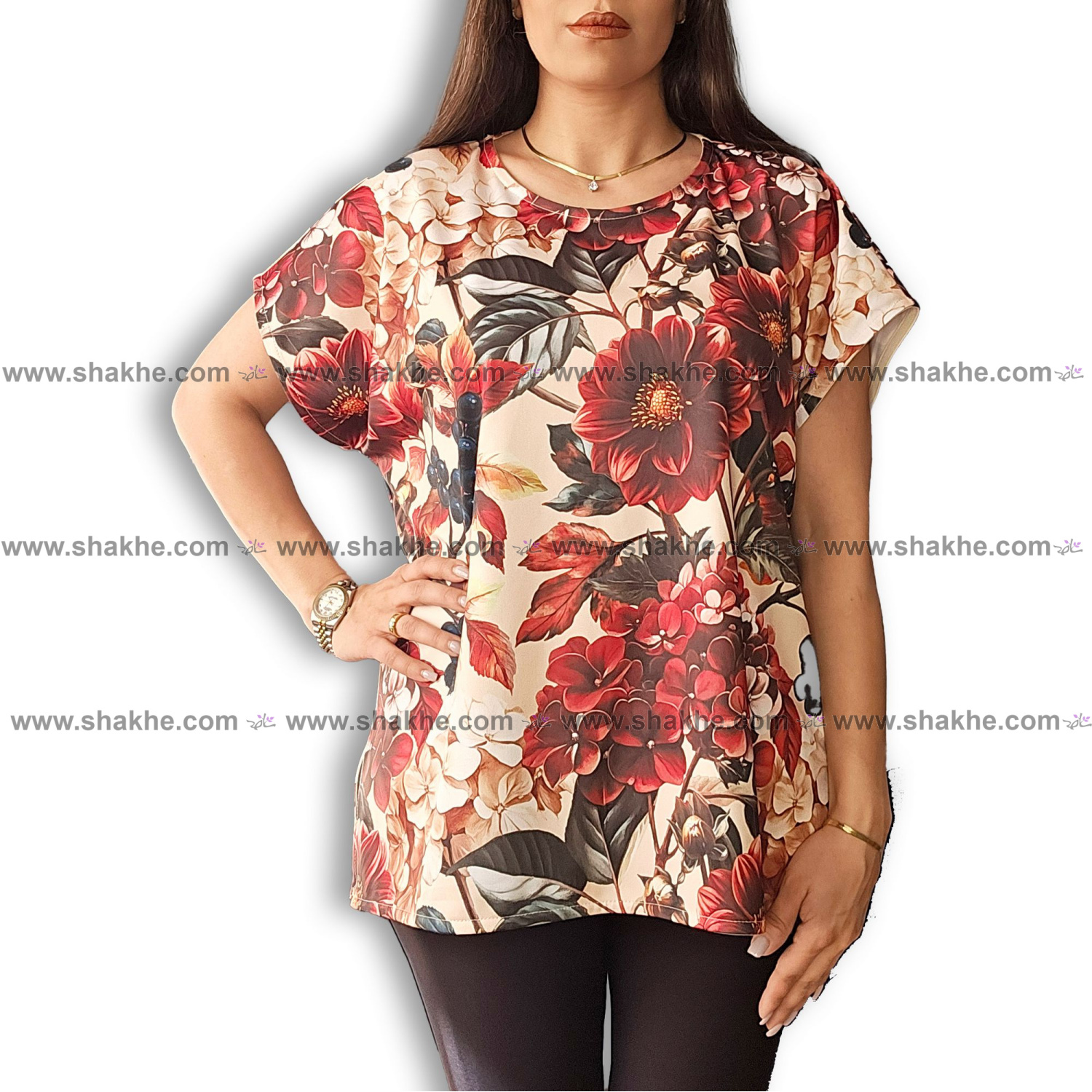 برای تیشرت زنانه از جنس کرپ شاین استفاده شده است، یقه تی شرت ها بصورت گرد و با آستین افتاده است. قد آن 67 سانتی متر است و از سایز های 36 تا 42 سایز می شود.