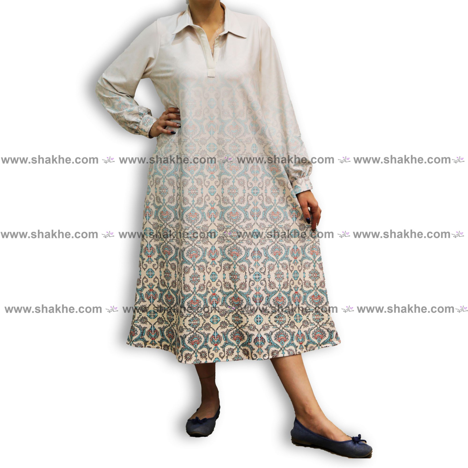 مانتو جلو بسته یقه مردانه گلنار کرم نیلی